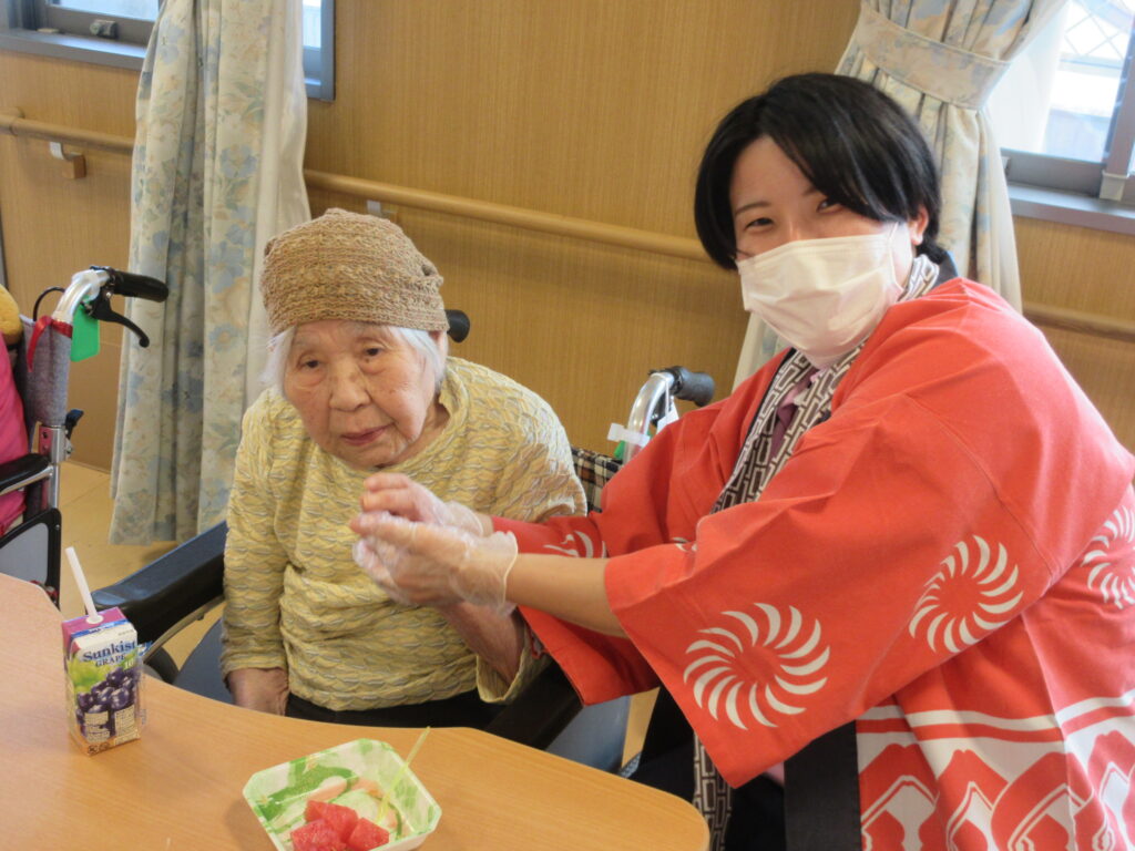入所者様へは事前に購入したスイカ、刻み食の方はスイカゼリーを提供し