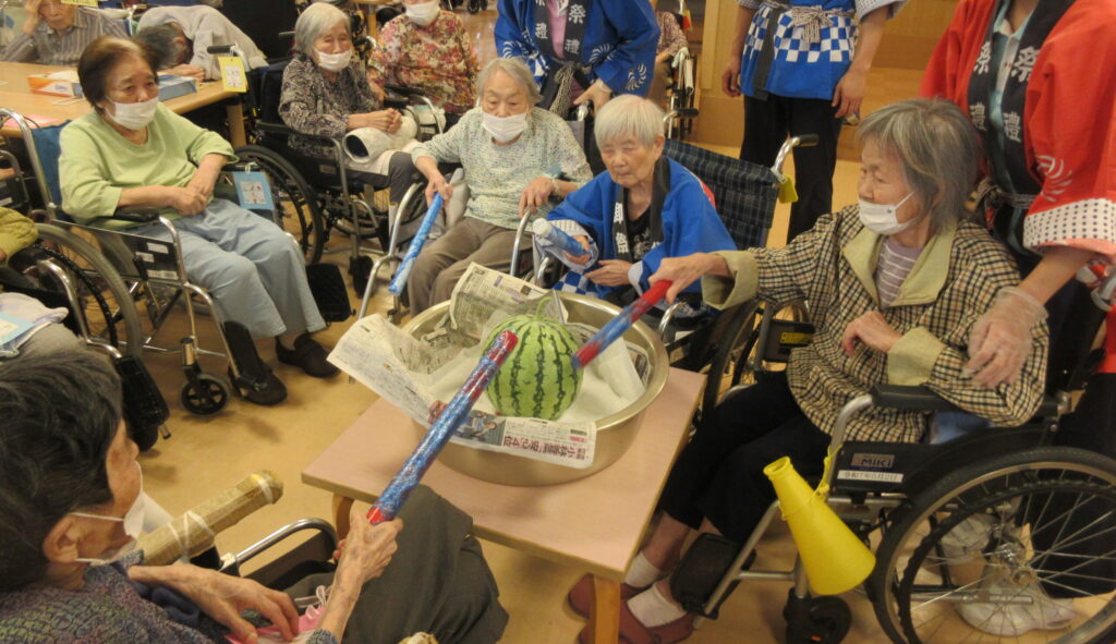 入所の夏祭りではスイカ割りを行いました。